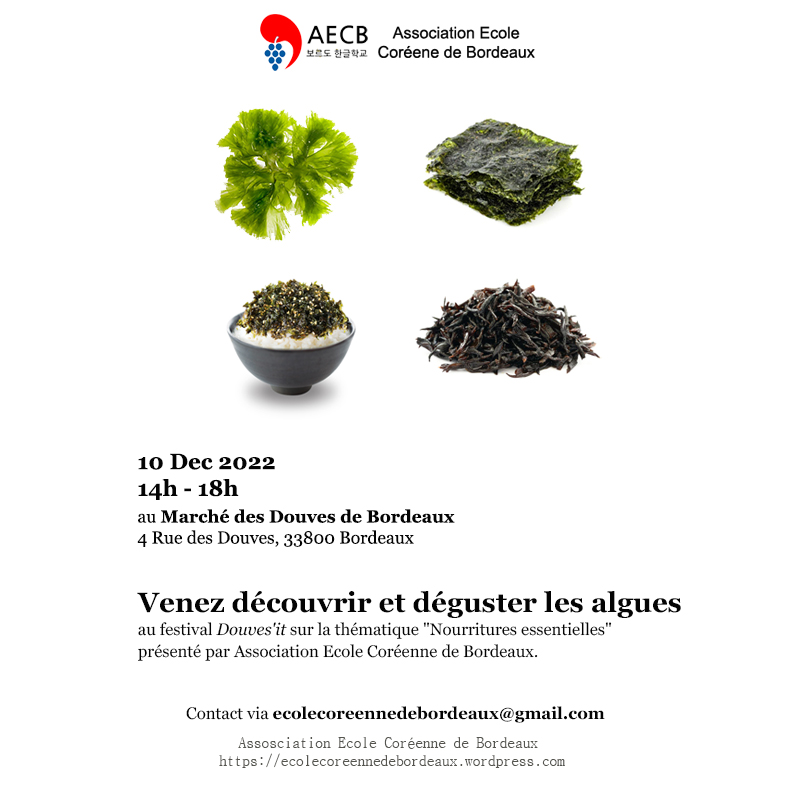Nous présenterons « Les algues » et diverses manières de les manger et nous interrogerons sur le caractère essentiel de cette nourriture dans la culture coréenne.