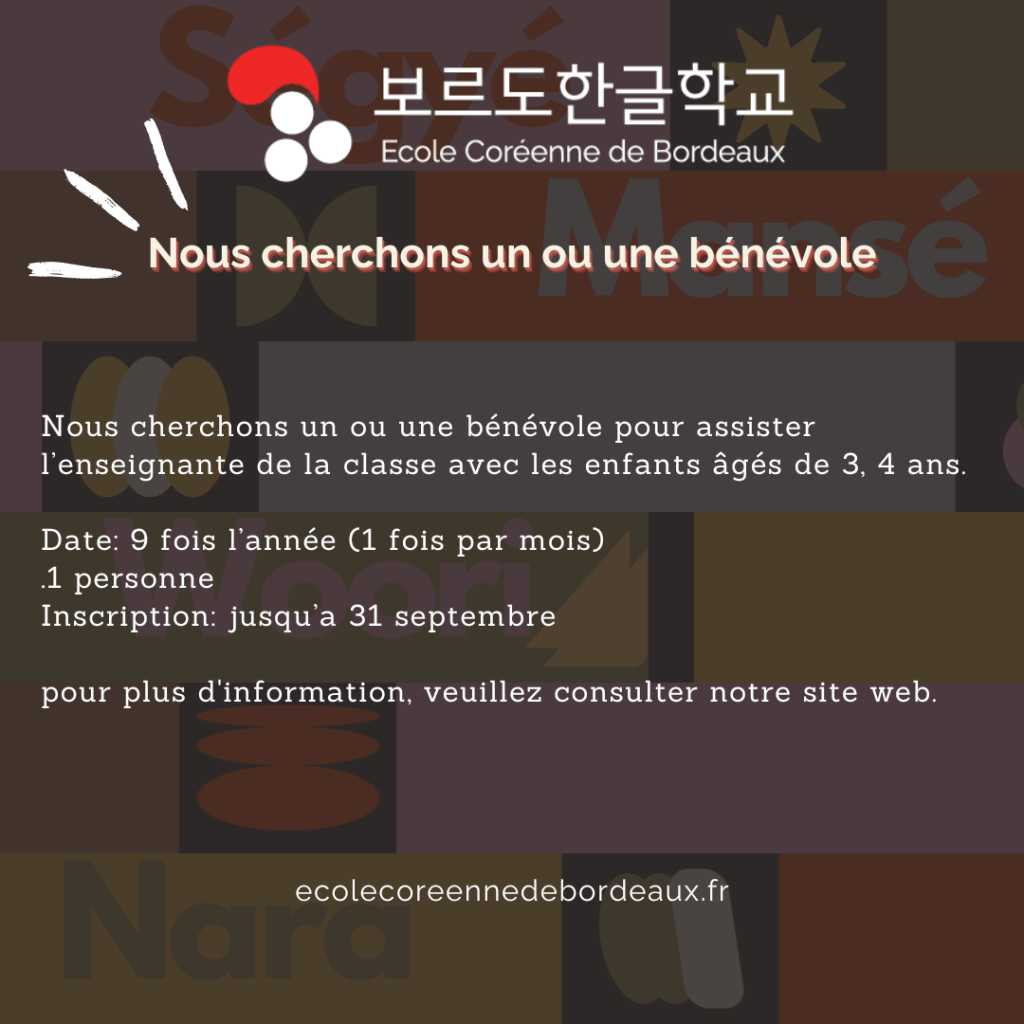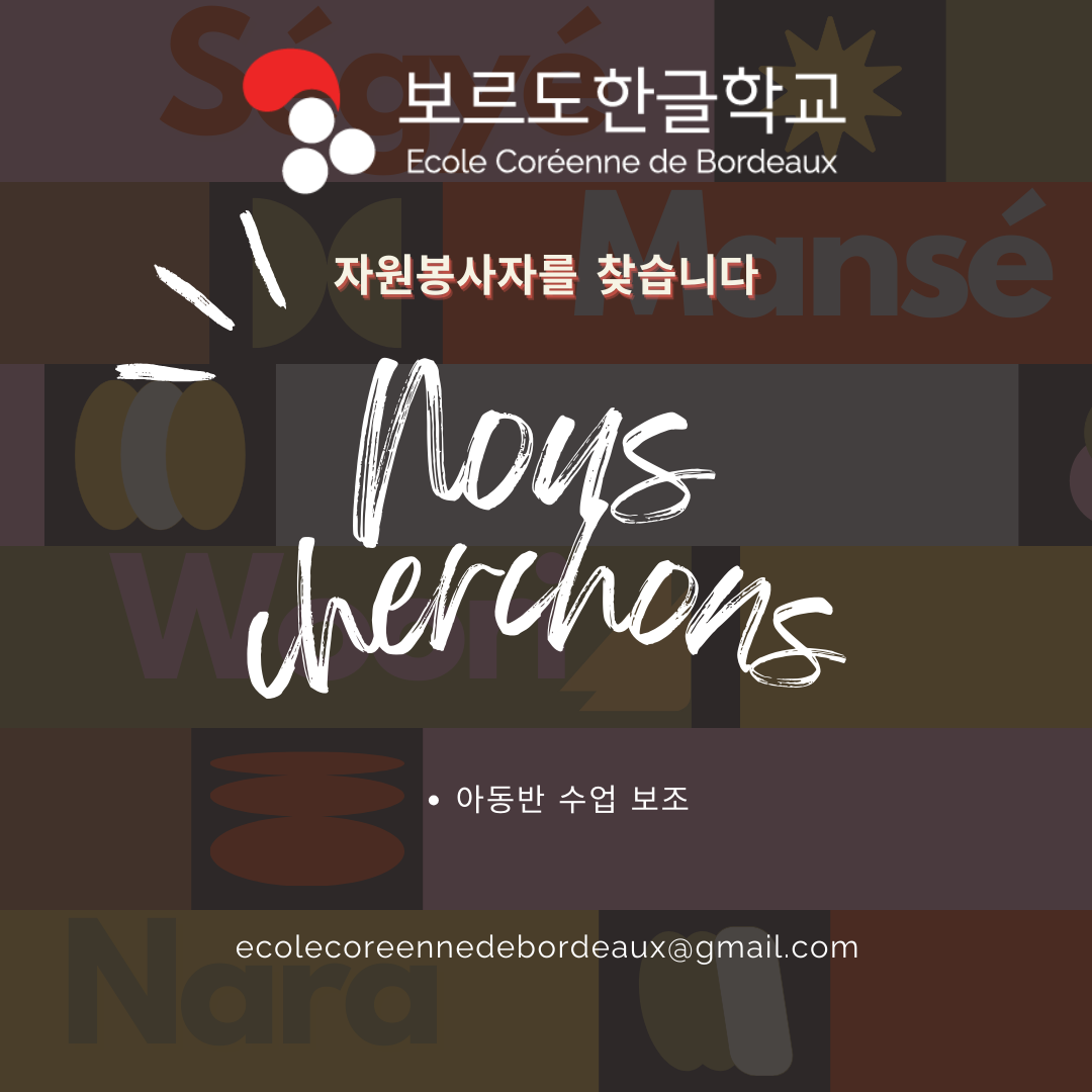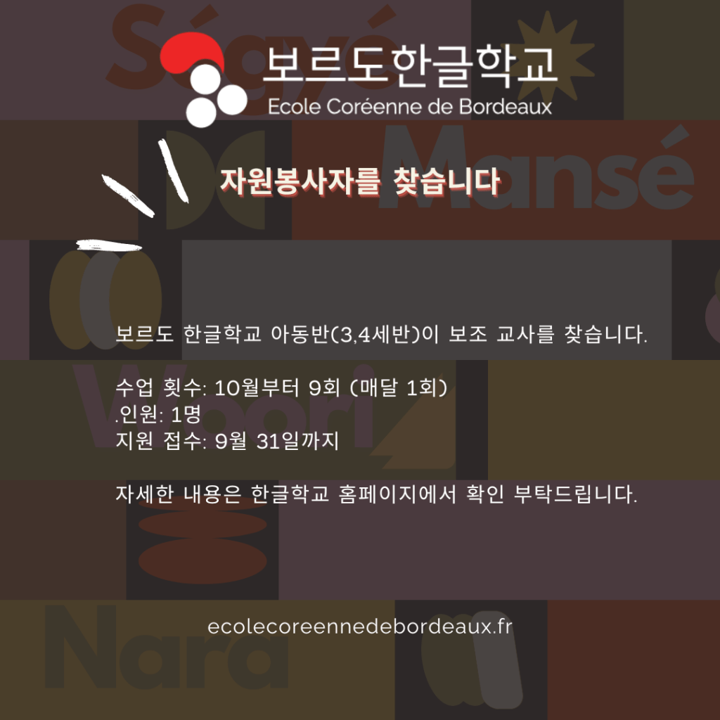 보르도 한글학교 아동반에서 수업 보조를 해주실 자원봉사자를 구합니다.