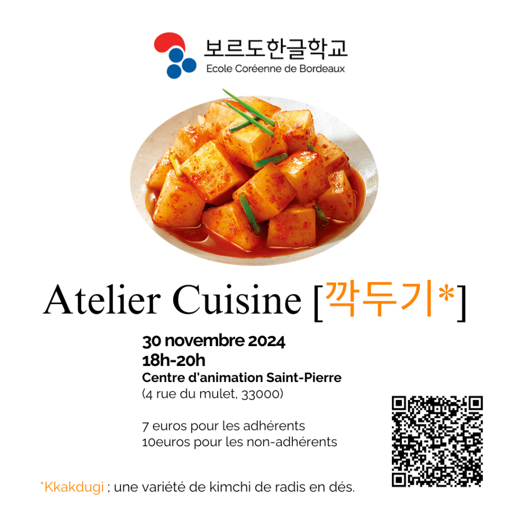 Nous sommes heureux de vous inviter toutes et tous à notre atelier cuisine de cette année et cette fois-ci, nous vous apprendrons à faire du Kkakdugi, le
