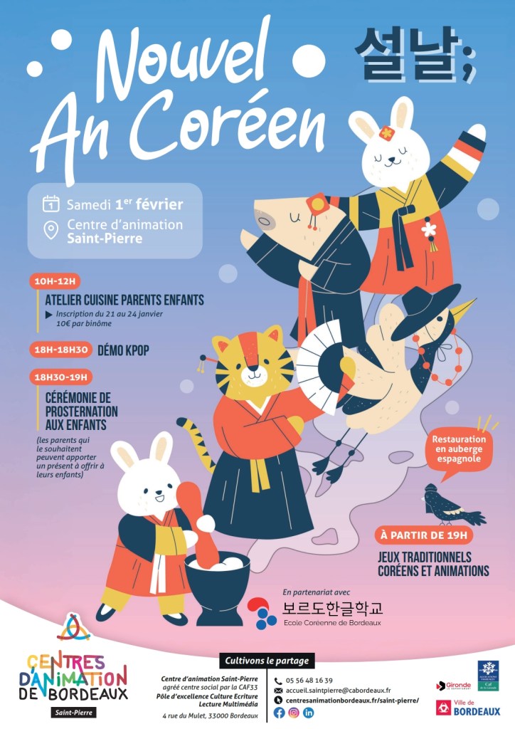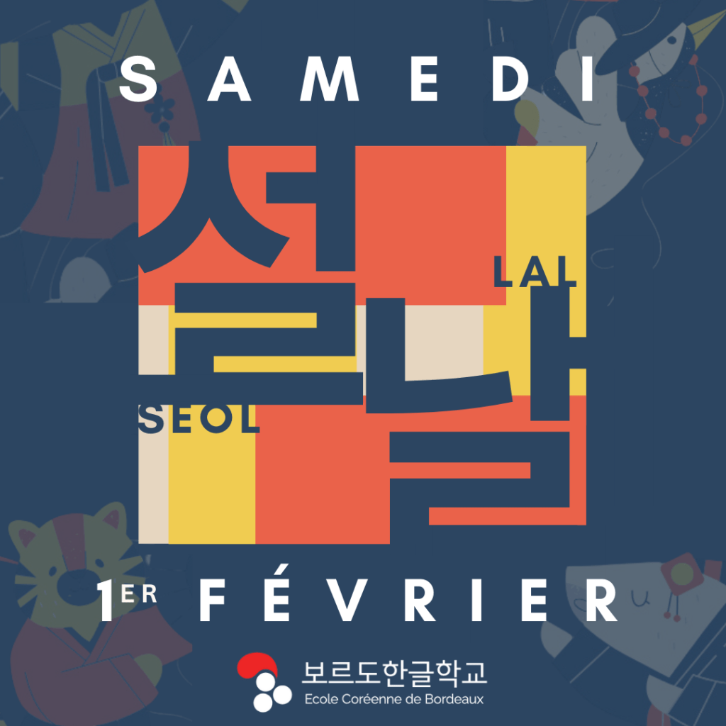 Nous avons le plaisir de vous annoncer que la célébration du Nouvel An Coréen (Seollal) 설날 se déroulera le samedi 1er février 2025 au centre d’animation St Pierre bordeaux. C’est un moment important pour découvrir et partager les traditions coréennes, et nous serions heureux de vous compter parmi nous pour cette journée festive !
