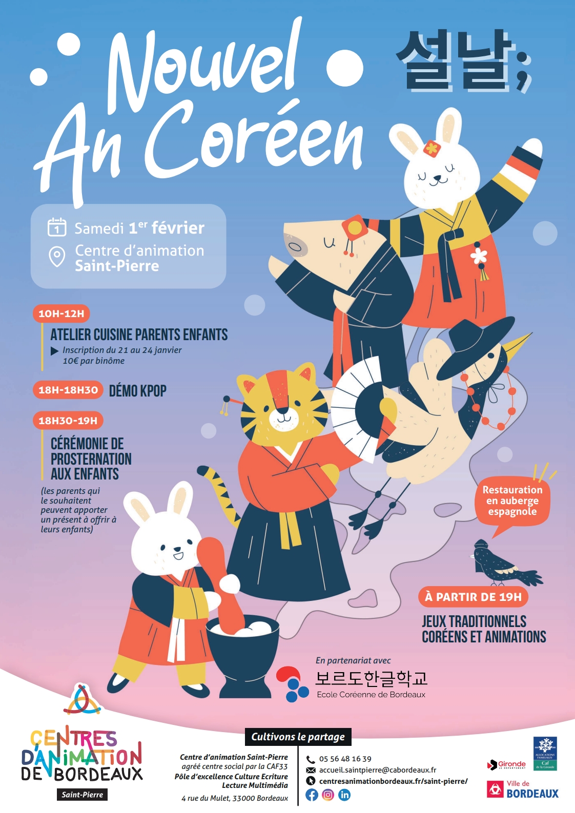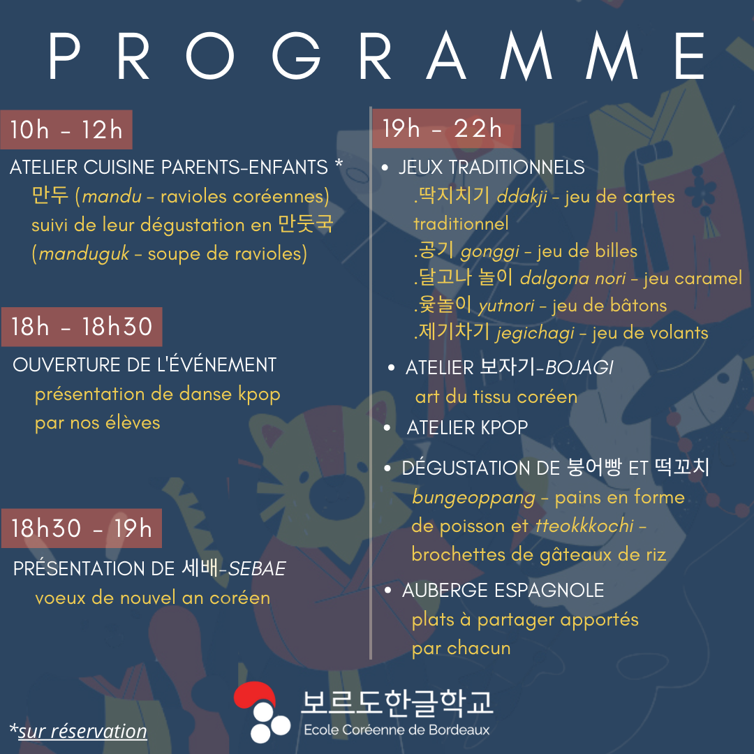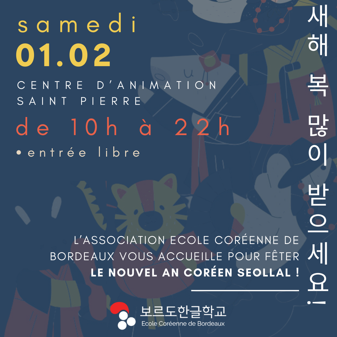 Nous avons le plaisir de vous annoncer que la célébration du Nouvel An Coréen (Seollal) 설날 se déroulera le samedi 1er février 2025 au centre d’animation St Pierre bordeaux. C’est un moment important pour découvrir et partager les traditions coréennes, et nous serions heureux de vous compter parmi nous pour cette journée festive !