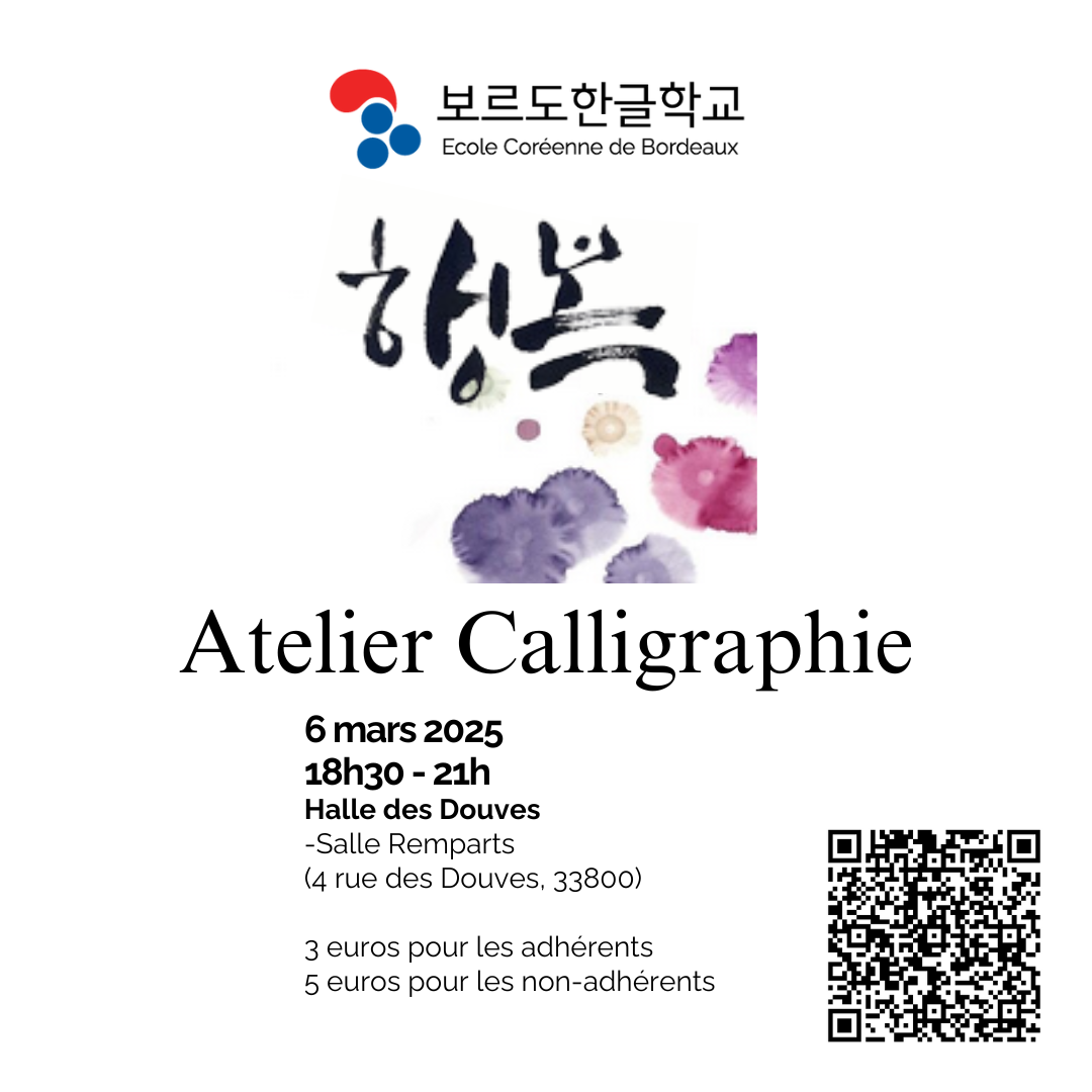 Tout le matériel est fourni, il suffit simplement de vous inscrire grâce au lien [QR code ou lien à la une] et de venir avec votre inspiration (une idée de ce que vous souhaiteriez écrire en hangeul).
