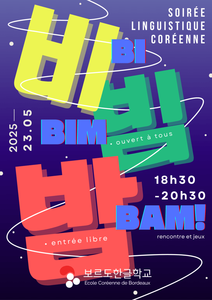 Accompagnée de boissons et animée par des jeux en lien avec la langue coréenne, cette soirée est avant tout faite pour se retrouver autour de notre intérêt commun pour le coréen. Débutant comme expert, tout le monde est invité à apprendre à se connaître autour de la langue coréenne !