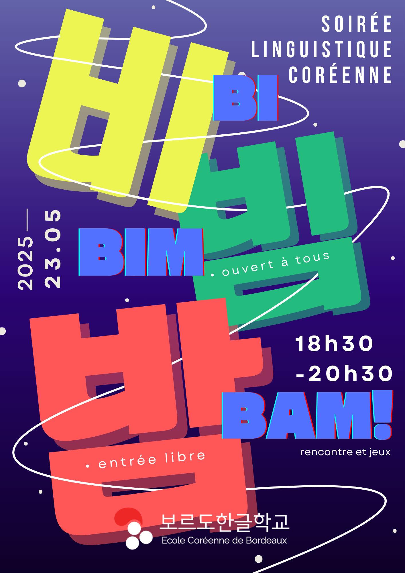 Accompagnée de boissons et animée par des jeux en lien avec la langue coréenne, cette soirée est avant tout faite pour se retrouver autour de notre intérêt commun pour le coréen. Débutant comme expert, tout le monde est invité à apprendre à se connaître autour de la langue coréenne !